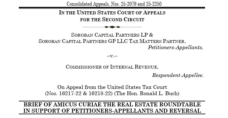 The Real Estate Roundtable (RER) filed an amicus brief this week with the Second Circuit Court of Appeals in Soroban Capital Partners LP v. Commissioner, a case that challenges the IRS’s restrictive interpretation of the “limited partner exception” from self-employment (SECA) taxes under section 1402(a)(13) of the tax code. (Amicus Brief, Dec. 15)