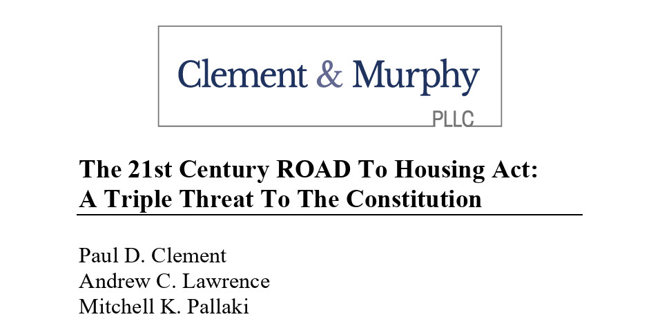 The Real Estate Roundtable (RER) this week released a white paper authored by Paul Clement of Clement & Murphy, PLLC, adding significant constitutional concerns to the growing case against Section 901 of Title IX of the Senate-passed 21st Century ROAD to Housing Act (H.R. 6644). While the broader legislation contains several constructive provisions to help boost housing supply, the Senate bill’s restrictions on certain institutional investors would undermine new development, disrupt the build-to-rent (BTR) market, and raise serious legal questions. (White Paper, April 14)