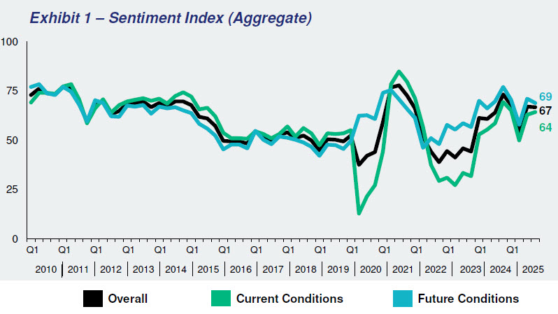 The Real Estate Roundtable’s (RER) Q4 2025 Sentiment Index registered an overall score of 67, equivalent to the prior quarter, reflecting that commercial real estate executives’ sentiment has shifted from caution toward guarded optimism as markets stabilize, transaction activity resumes, and expectations build for easing interest rates in 2026.